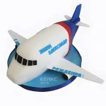 Торт в виде самолета с динамичным дизайном. Синий хвост эффектно контрастирует с белым корпусом, создавая ощущение полета. Пропеллер и иллюминаторы проработаны с вниманием к деталям. Композиция передает легкость и движение, будто самолет застыл в воздухе. Цветовое решение напоминает небо и облака, усиливая тематику авиации.