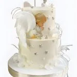 Торт «Серебряные крылья» завораживает своей космической эстетикой. На тёмно-синем фоне, напоминающем ночное небо, парят серебристые крылья с тончайшими перьями. Верхний ярус украшен мерцающими звёздами, создавая иллюзию полёта в бескрайней вселенной. Сочетание глубокого синего и холодного серебра рождает ощущение таинственности и волшебства.