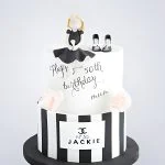 Этот торт — воплощение элегантности и стиля. Два яруса, покрытые гладкой мастикой в фирменных оттенках Chanel: чёрный и бежевый. Верхний ярус украшен тонкими золотыми линиями, имитирующими знаменитый узор бренда. На вершине — миниатюрная фигурка девочки в платье, напоминающем классический костюм Chanel. Лёгкие складки мастики создают эффект ткани, а лаконичные детали подчёркивают изысканность. Торт выглядит как маленькое произведение искусства, сочетающее в себе роскошь и игривость.