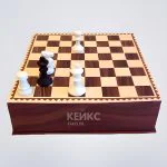 Этот торт — настоящая шахматная доска, выполненная с удивительной точностью. Квадратная форма и контрастные черно-белые клетки создают эффект классической партии. Фигурки из мастики расставлены так, будто игра только началась. Яркие акценты красного и золотого добавляют торту праздничный вид, напоминая о важном событии. Такой торт точно удивит любого юного шахматиста и станет центром внимания на празднике.