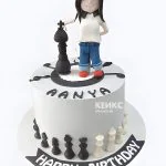 Этот торт — настоящая шахматная доска в сладком исполнении! Четкие черно-белые клетки создают графичный контраст, а фигурка маленькой шахматистки в центре добавляет игривости. Гладкая мастика имитирует глянцевую поверхность игрового поля, а аккуратные бортики подчеркивают геометрию. Торт выглядит одновременно стильно и по-детски задорно — будто приглашает в увлекательную партию.