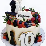 Этот торт – настоящая шахматная доска из крема, где белые и шоколадные квадраты создают эффектную геометрию. Венок из свежих ягод обрамляет верхний край, добавляя сочные акценты малины, ежевики и смородины. Прохладные оттенки ягод контрастируют с теплыми кремовыми тонами, а их естественная форма смягчает строгие линии шахматного узора. Торт выглядит одновременно графичным и живым – как будто кусочек игры ожил на сладком полотне.