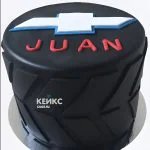 Автомобильный торт в виде стильного колеса Chevrolet сразу привлекает внимание. Черная мастика с серебристыми деталями точно передает брутальный шик автодизайна. Фотопечать добавляет реалистичности, создавая эффект настоящего колеса. Контраст глянцевых и матовых поверхностей играет на свету, подчеркивая рельефность диска. Этот торт — воплощение динамики и стиля, который оценят ценители мощных машин.