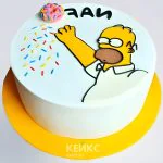 Этот круглый одноярусный торт украшен яркой мастикой в стиле мультсериала «Симпсоны». Основной декор — аппликация с изображением Гомера Симпсона, выполненная из цветной мастики. Торт выглядит очень празднично и идеально подойдет для фанатов культового мультфильма. Простое, но эффектное оформление делает его отличным выбором для тематического торжества.