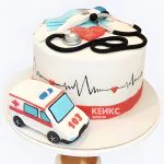 Медицинская тематика торта выражена через изящную фигурку стетоскопа и аккуратные красные кресты на белоснежной поверхности. Сочетание чистого белого и насыщенного красного создает выразительный контраст. Лаконичный дизайн передает атмосферу профессиональной точности, а гладкая текстура мастики добавляет торту визуальной гармонии. Каждый элемент композиции тщательно продуман и выполнен с вниманием к деталям.