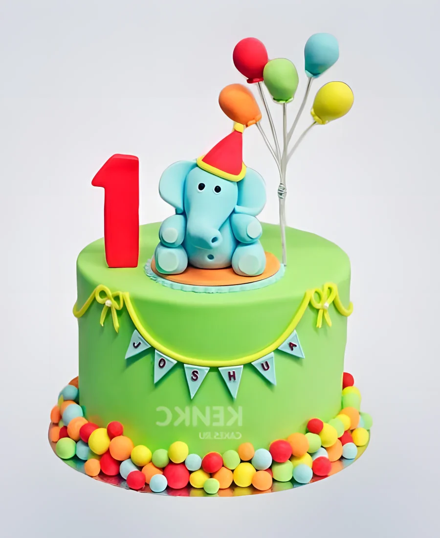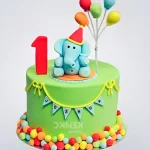 Ярко-зеленый торт со слоником с воздушными шарами и цифрой 1