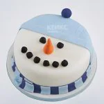 Этот очаровательный круглый торт в белоснежной мастике словно создан для зимней сказки. На его поверхности расположился улыбающийся снеговик с яркой морковкой-носом и шарфиком в сине-голубых тонах. Аппликация из мастики передает пушистые снежные сугробы и легкие снежинки, создавая атмосферу волшебного новогоднего утра. Контраст белого фона с сочными акцентами делает торт по-настоящему праздничным и живым.