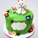 Очаровательный круглый торт, украшенный белоснежной мастикой. Главный акцент — милая фигурка собачки, окруженная зеленой травкой из мастики. Торт выполнен в нежных пастельных тонах, идеально подходит для детского праздника. Простой, но очень трогательный дизайн с одним ярусом делает его милым и уютным. Украшения из мастики придают торту особую воздушность и праздничное настроение.