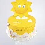 Солнечный торт в ярко-желтых тонах создает по-настоящему летнее настроение. Лучики из мастики расходятся от центра, образуя стилизованное солнышко. Белая цифра на торте контрастно выделяется на фоне жизнерадостного желтого цвета. Гладкая поверхность мастики и аккуратные детали придают торту особую выразительность. Композиция наполнена светом и теплом, словно кусочек лета на тарелке.