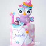 Этот элегантный одноярусный торт украшен реалистичной фигуркой совы, выполненной из мастики. На белоснежной глазури размещена надпись, а вокруг совы — декоративные элементы в природном стиле. Торт выглядит стильно и гармонично, идеально подходит для тематического праздника.