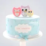 Этот очаровательный круглый торт украшен нежной голубой мастикой, создающей эффект бархатистой поверхности. Главный акцент декора — милые фигурки совят, которые придают торту трогательный и сказочный вид. Элегантный бантик дополняет композицию, добавляя торту праздничное настроение. Идеальный вариант для детского праздника или тематического мероприятия.