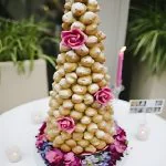 Этот свадебный торт — настоящее произведение искусства, собранное из нежных эклеров и воздушных профитролей в форме элегантного крокембуша. Белоснежные элементы создают ощущение легкости и праздничной торжественности, а золотистые карамельные нити добавляют нотки роскоши. Композиция напоминает изысканное кружево, переплетенное с карамельным сиянием. Торт выглядит одновременно хрупким и монументальным, словно воплощение мечты в кондитерском искусстве.