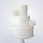 Белый трехъярусный недорогой свадебный торт с квадратами и цветами
