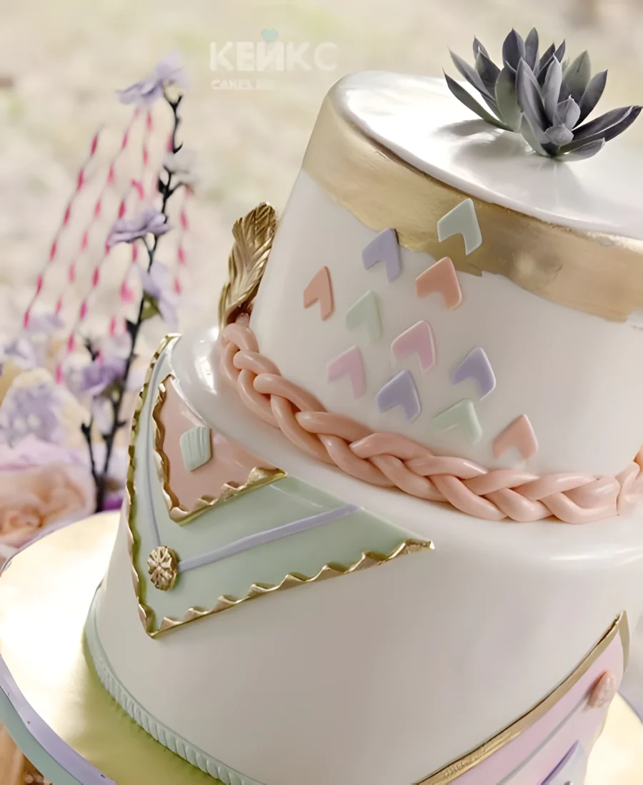 Свадебный торт в стиле бохо с орнаментом и персиковой косой