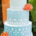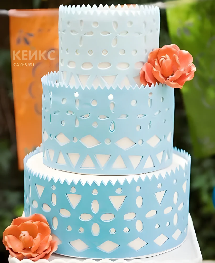 Бело-голубой свадебный торт в стиле бохо с цветами