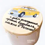 Этот торт мгновенно привлекает внимание благодаря яркому образу такси. Жёлтый фон с чёрными деталями создаёт узнаваемый городской силуэт. Фотопечать добавляет реалистичности — кажется, будто машина вот-вот тронется с поверхности десерта. Шутливая надпись превращает торт в забавный акцент праздника, особенно удачный для тематической вечеринки или дня рождения автолюбителя. Простота формы компенсируется сочностью красок и динамичным сюжетом.