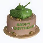 Этот торт — настоящий праздник для маленького любителя военной техники! Круглая форма покрыта гладкой мастикой в хаки, создавая эффект поля боя. По всей поверхности рассыпаны миниатюрные танки разных моделей, будто готовые к сражению. Яркие акценты в виде снарядов и флажков добавляют динамики. Строгие геометрические узоры и камуфляжные элементы подчеркивают тематику. Торт выглядит как игровая площадка, где разворачиваются захватывающие баталии.
