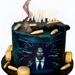 Торт темный с фото Джона Уика и фигурками пистолета и патронов
