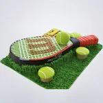 На фотографии запечатлен удивительно реалистичный торт в виде теннисной ракетки и мячика, лежащих на зеленой траве. Тщательно проработанная текстура струн ракетки и ворсистая поверхность мячика создают полную иллюзию спортивного инвентаря. Сочная зелень «травяного» покрытия и контрастные белые линии разметки добавляют композиции динамики и жизненной энергии. Этот торт словно переносит на корт в разгар захватывающего матча.