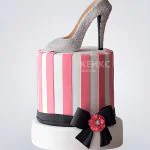 Этот торт — элегантное воплощение изысканного стиля. Черный атласный бант, аккуратно уложенный на матовой поверхности, создает эффектный контраст с нежно-розовыми полосками. Миниатюрная туфелька из мастики добавляет нотку игривости и напоминает о сказочных превращениях. Плавные линии и мягкие переходы оттенков делают его похожим на дорогую шкатулку. Каждая деталь продумана до мелочей, создавая гармоничный и запоминающийся образ.