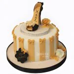 Этот торт — настоящее воплощение женственности и стиля. Нежная пастельная палитра с чередованием розовых и бежевых полос создает эффект изысканной упаковки. В центре внимания — миниатюрная туфелька из мастики, выполненная с удивительной детализацией: изгибы каблука, переплетение лент и даже текстура ткани. Мягкие складки мастики у основания имитируют шелковую ткань, добавляя торту воздушности. Сдержанный декор из жемчужных бусин и тонких золотых линий подчеркивает элегантность композиции, превращая десерт в маленькое произведение искусства.