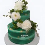 Торт в изумрудном цвете с пышными цветами и золотыми деталями