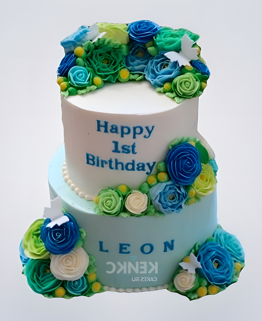Нежный торт, словно сошедший со страниц восточной сказки. Два яруса покрыты облачно-голубым кремом с мягкими, стекающими наплывами. Белоснежные цветы и бутоны, искусно выполненные из крема, рассыпаны по всей поверхности, создавая ощущение весеннего сада. Лаконичные золотистые акценты деликатно подчеркивают изящество композиции, добавляя торжественности. Общая палитра — умиротворяющее сочетание белого, небесно-голубого и теплого золота — вызывает чувство спокойствия и безмятежности.