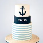Этот торт — настоящее морское приключение! Три яруса, покрытые гладкой мастикой, напоминают волны. Сине-голубая гамма с белыми бликами создает ощущение свежести и простора. Якорь, штурвал и канаты из мастики добавляют атмосферу морского путешествия. Четкие линии и детали делают торт стильным и лаконичным, будто он сошел с палубы корабля.