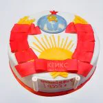 Этот торт — настоящая ностальгическая машина времени! На белоснежной мастике ярко выделяются узнаваемые советские символы: алые звёзды, серп и молот, значки пионеров. Контрастная красно-белая гамма создаёт праздничное настроение, а лаконичные графичные элементы будто сошли со старых открыток. Торт напоминает о парадах, пионерских галстуках и общем ощущении детства. Каждый элемент выполнен с трогательной точностью — даже шрифт надписи будто взят из советских учебников.