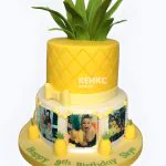 Невероятно реалистичный торт в форме сочного ананаса! Два яруса покрыты ярко-желтой мастикой с текстурой тропического фрукта. На поверхности размещены черно-белые фотографии, создающие трогательный контраст с жизнерадостным фоном. Зеленый мастичный лист на вершине завершает образ. Эмоциональный и персонализированный десерт, который рассказывает историю через снимки.