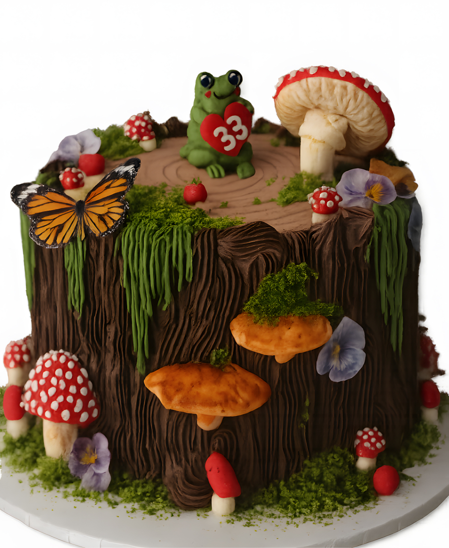 Торт в виде пня с мухоморами и опятами