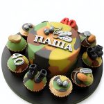 Этот торт в военной тематике выполнен в насыщенных оттенках хаки и оливкового. Матовое мастичное покрытие имитирует камуфляж, а аккуратные складки создают эффект военной формы. Верх украшен композицией из миниатюрных кексов, стилизованных под снаряды, и декоративными элементами в виде звёзд. Строгие геометрические линии и лаконичный дизайн передают дух армейского стиля.