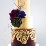 Роскошный трёхъярусный торт в восточном стиле. Глубокий бордовый цвет гармонично сочетается с изящными золотыми узорами, создавая атмосферу восточной сказки. Нежные розы из мастики добавляют торту утончённости и романтичности. Каждый элемент декора продуман до мелочей, создавая впечатление драгоценного произведения искусства.
