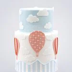 Нежный двухъярусный торт в пастельных тонах создает ощущение легкого воздушного праздника. Голубой фон напоминает чистое небо, по которому парят разноцветные шарики из мастики. Каждый шар имеет свой уникальный узор — в горошек, полоску, с золотистыми блестками. Композиция выглядит динамично и радостно, словно шары только что взлетели ввысь. Серебристая нить, соединяющая шары, добавляет торту изящества и завершенности.