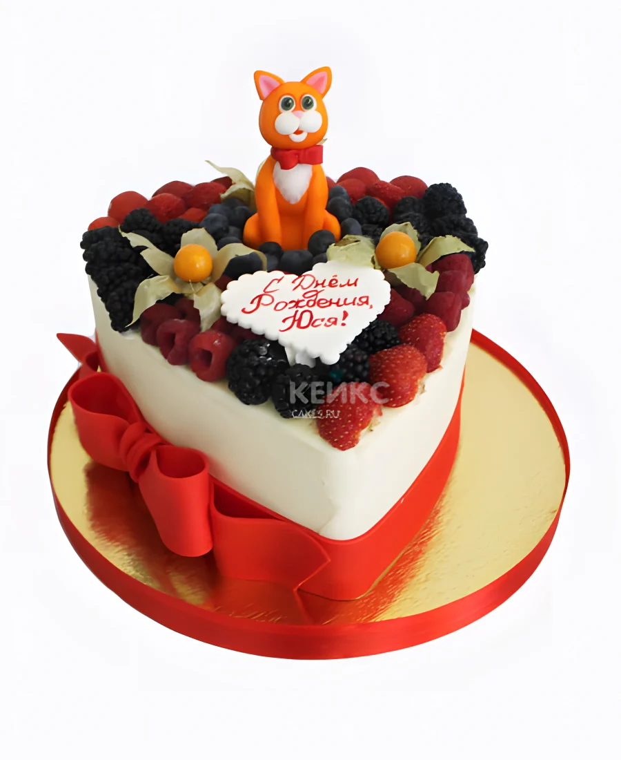 Торт в форме сердца с ягодами и котом