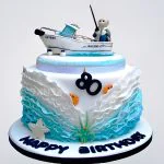 Этот торт — настоящая морская фантазия! Белоснежная мастика имитирует легкие волны, по которым гордо плывет миниатюрная яхта с детализированными парусами. Нежные рюши по бортику напоминают кружевную пену прибоя. Голубые и синие акценты создают ощущение свежего морского бриза, а золотистые элементы добавляют торту нотки роскоши. Композиция с канатами и якорем завершает морской ансамбль, превращая десерт в маленькое произведение искусства.