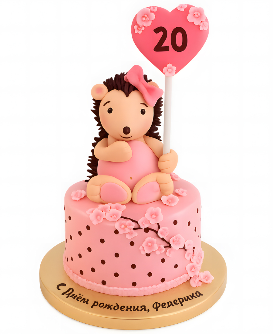 Очаровательный круглый торт в виде милого ёжика. Нежно-розовая мастика создает трогательный образ. На спинке — узор из белых сердечек, добавляющих торту нежности. Черные бусинки-глазки и аккуратный носик придают выразительность. Лаконичный и милый дизайн вызывает улыбку и создает праздничное настроение.