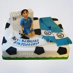 Квадратный торт в сине-голубой гамме с динамичным изображением футболиста в движении. На переднем плане — узнаваемый шарф с символикой клуба, создающий эффект присутствия на стадионе. Фотопечать передает мельчайшие детали формы и эмоции игры. Сочетание глубокого синего и белого вызывает ассоциации с командными цветами, создавая атмосферу спортивного праздника.