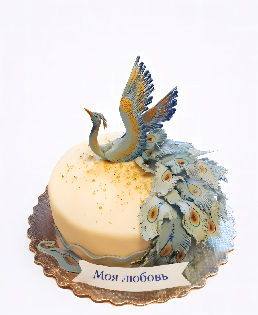 Этот торт — словно ожившая сказка. На белоснежной мастике расцветает волшебная Жар-птица с переливающимися золотыми и алыми перьями. Её изящные крылья будто застыли в полёте, а хвост струится роскошными волнами. Тонкие детали оперения проработаны с ювелирной точностью, создавая ощущение движения. Фон украшен нежными цветочными узорами и золотыми акцентами, которые перекликаются с оперением птицы. Композиция торта наполнена магией и лёгкостью, словно перенесённая со страниц старинной сказки.