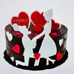 Романтичный круглый торт в нежных пастельных тонах. Основа украшена золотистыми сердечками и изящными завитками, создающими ощущение легкости. В центре – фигурки влюбленной пары, окруженные воздушными рюшами из мастики. Мягкие розовые и бежевые оттенки гармонично сочетаются с золотыми акцентами, придавая торту праздничный и трогательный вид. Каждый элемент продуман и добавляет образу нежности.