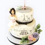Этот элегантный круглый торт в пастельных тонах переносит в романтичную атмосферу Парижа. Нежная композиция из розовых и кремовых оттенков украшена миниатюрной Эйфелевой башней и стилизованной фигуркой девушки. Мастика создает эффект мягких складок, напоминающих шелковую ткань. Розовые цветы и золотистые акценты добавляют торту легкость и изысканность. Каждая деталь продумана, чтобы передать ощущение праздника и утонченности.
