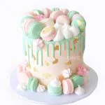 Воздушное облако из белоснежной мастики украшено нежными макарунс и хрустальными каплями безе. Пастельные розовые и золотые акценты создают атмосферу утончённой элегантности. Лёгкие цветочные узоры и перламутровый блеск добавляют торту волшебное сияние, напоминая изысканное произведение искусства.