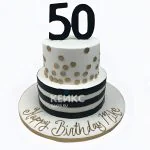 Этот впечатляющий многоярусный праздничный торт украшен свежими цветами и оригинальным декором в фиолетовых тонах. Допонен золотой посыпкой в честь юбилейной годовщины. В середине торта имеется поздравительная надпись в виде цифры «50», выполненная из сливочного шоколада и украшенная сиреневой орхидеей и хризантемой.