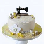 Этот элегантный круглый торт выполнен в нежных пастельных тонах с акцентами золотистого цвета. Центральным элементом стала миниатюрная швейная машинка из мастики, окружённая изящными нитями и бусинами. Торт украшен тонкими цветочными узорами и кружевными деталями, создающими ощущение уюта и тепла. Композиция передаёт атмосферу творчества и рукоделия, а мягкие переходы оттенков добавляют торту лёгкости и изысканности.
