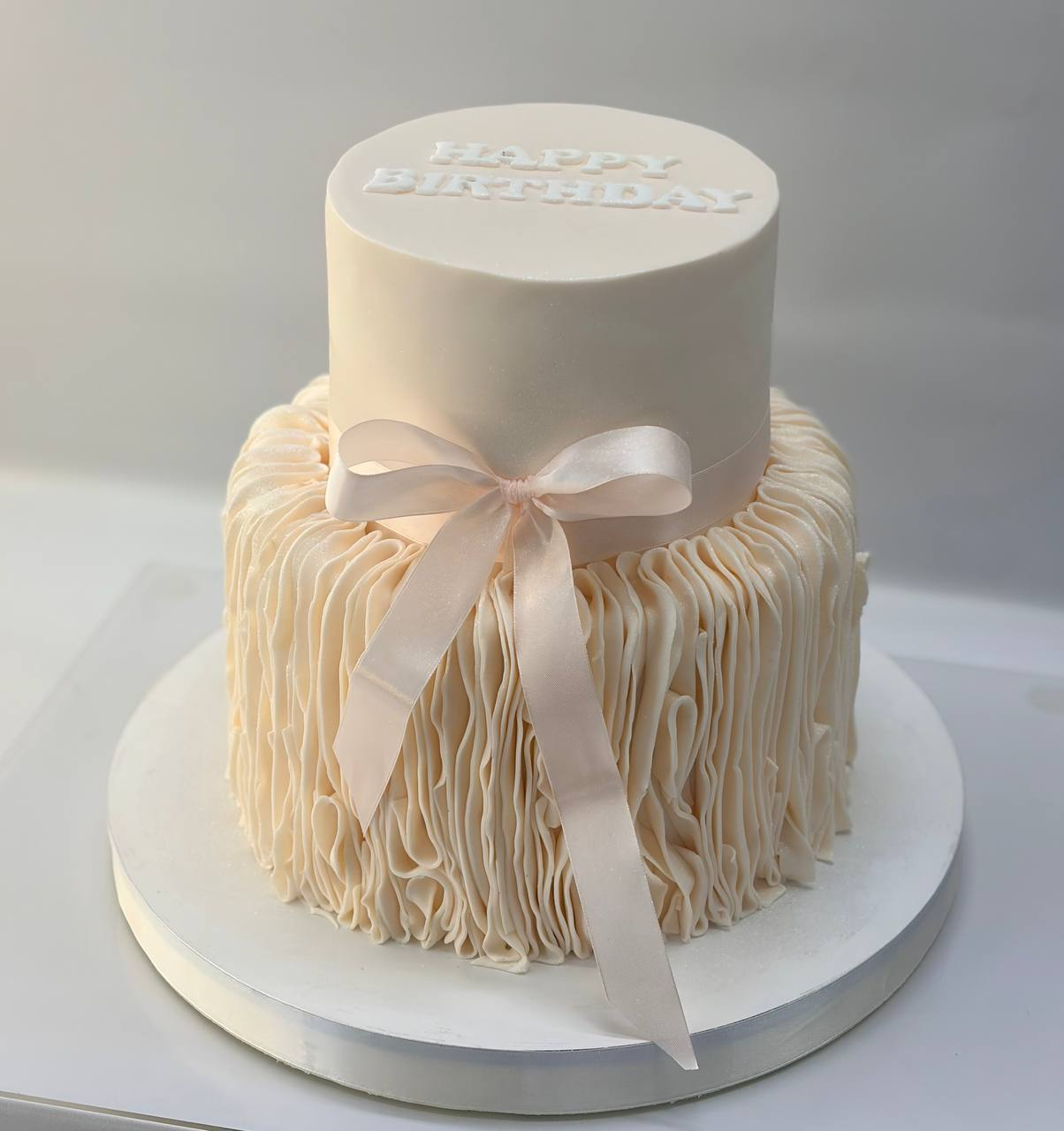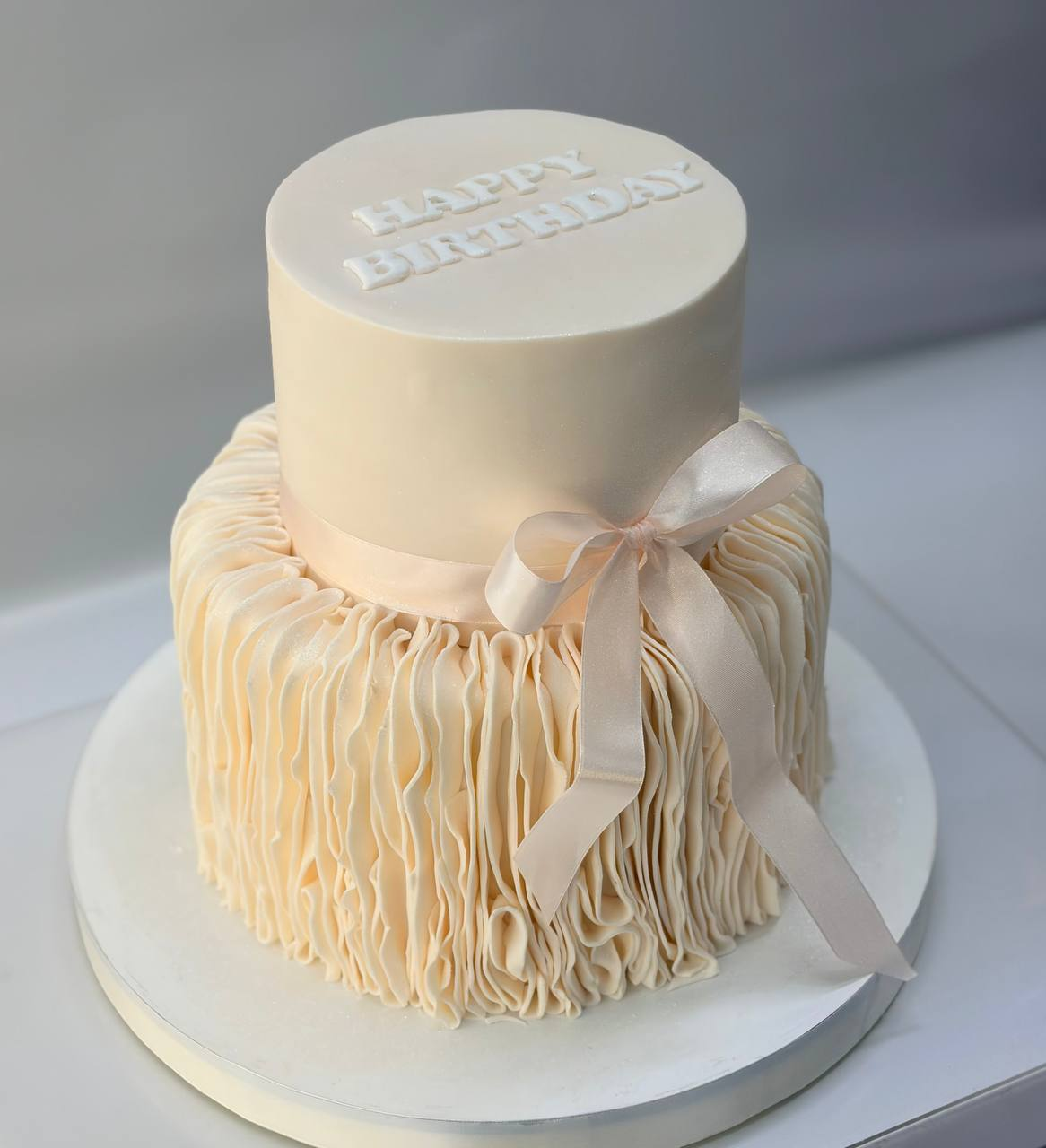 Торт выполнен в нежных персиковых тонах, создающих ощущение тепла и света. Два яруса украшены элегантной текстурой, напоминающей шелк или мягкие складки ткани. Центральным элементом является изящный бант из мастики, добавляющий торжественности и нарядности. Общая композиция выглядит воздушно и празднично, словно окутанная лёгким сиянием.