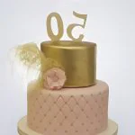 Золотисто-розовый двухъярусный праздничный торт ко Дню рождения или годовщине свадьбы. Украшен поздравительной надписью по центру, орхидеями и хризантетами в виде цифры «50». Покрыт нежным и сливочно-ванильным кремом