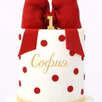 Нежный белоснежный торт украшен элегантными деталями в ярко-красных тонах. Изящный бант и цифра создают праздничное настроение, а аккуратные точки добавляют динамики в композицию. Лаконичное сочетание белого и красного вызывает ощущение торжественности и радости. Такой десерт станет центром внимания на любом празднике, особенно в день рождения.