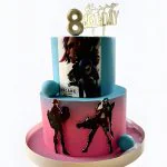 Этот двухъярусный торт словно сошел со страниц фантастического комикса. Велюровое покрытие глубокого фиолетового оттенка создает бархатистую текстуру, напоминающую ночное небо. Фотопечать переносит нас в загадочный мир Аркейна, где переплетаются магия и технологии. Серебристые аппликации добавляют торту футуристического шарма, а контрастные акценты подчеркивают динамику сюжета. Кажется, будто перед нами портал в другую вселенную, застывший в сладкой форме.