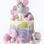 Этот торт — настоящая сказка в пастельных тонах! Нежный розовый крем создает воздушную основу, а золотистые брызги добавляют волшебства. Главный герой — очаровательный единорог с серебристой гривой, окруженный облаками из крема. Яркая цифра, выполненная в тонкой цветовой гамме, гармонично дополняет композицию. Мягкие переходы оттенков и деликатные детали создают ощущение легкости и праздника.
