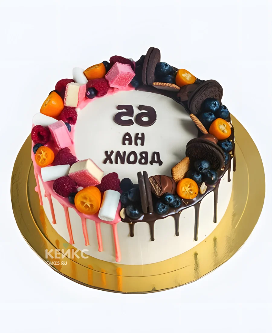 Воздушный торт женщине на 65 лет с ягодами и шоколадом